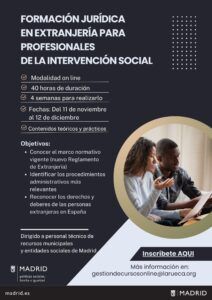 En un contexto de constante evolución normativa, contar con conocimientos actualizados en extranjería es esencial para quienes trabajan en la intervención social. Por eso, desde las Oficinas Municipales de Información, Orientación y Acompañamiento para la Integración Social de la población inmigrante, lanzamos una nueva edición del curso “Formación jurídica en extranjería para profesionales de la intervención social”.