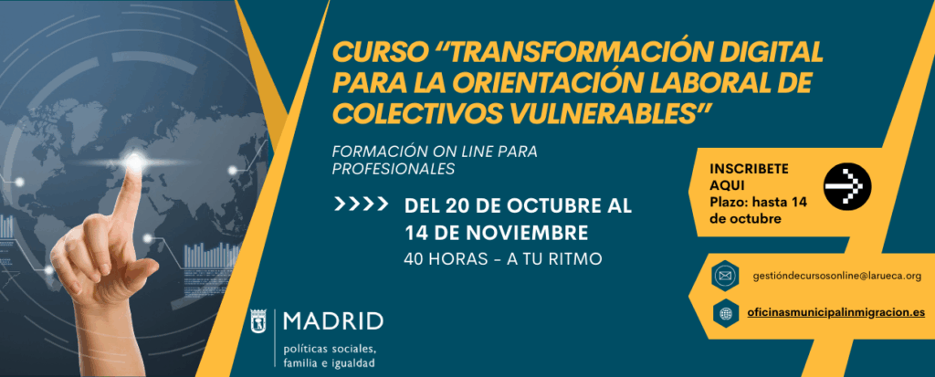 Curso Online: Transformación Digital Para la Orientación Laboral de Colectivos Vulnerables En un mundo cada vez más digital, el acceso a la tecnología se ha convertido en una puerta de entrada a derechos, servicios y oportunidades. Sin embargo, muchas personas aún...