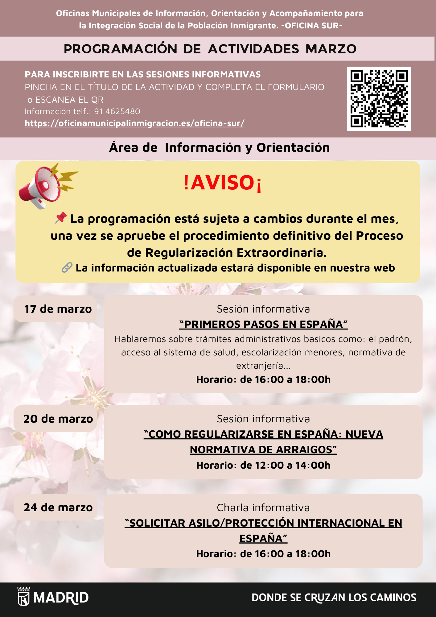 Consulta toda la programación actual de la  Oficina Municipal de Información, Orientación y Acompañamiento para la integración Social de la Población Inmigrante Sur.